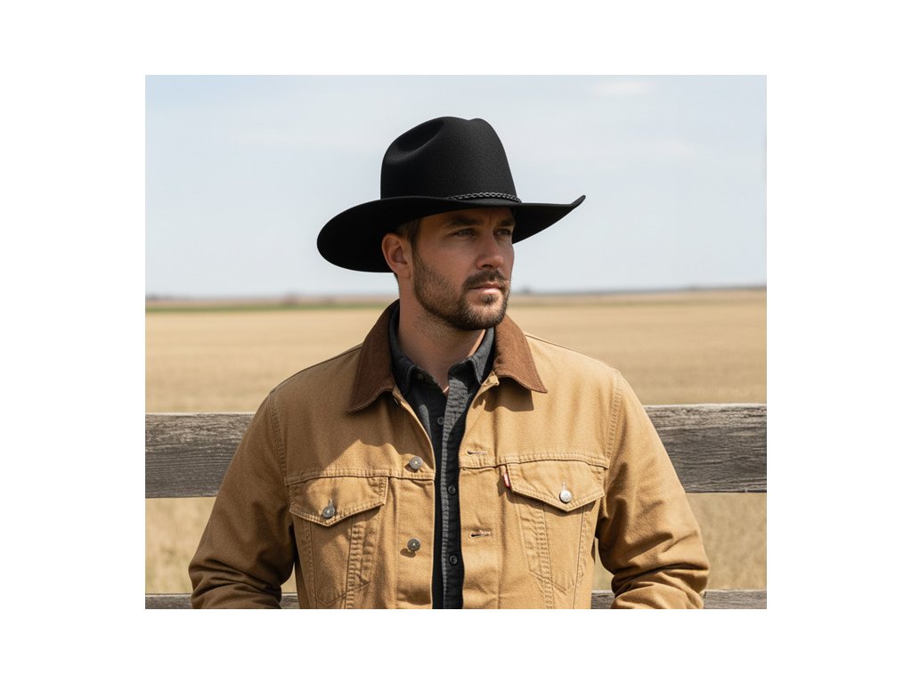 Pletený čierny kožený opasok dodáva klobúku typický westernový výraz a funguje ako jeden z detailov, ktoré z neho robia skutočne originálny model. Strieška o šírke približne 8 cm je výrazná, zakrivená a poskytuje účinnú ochranu pred slnkom aj nepriaznivým počasím.
