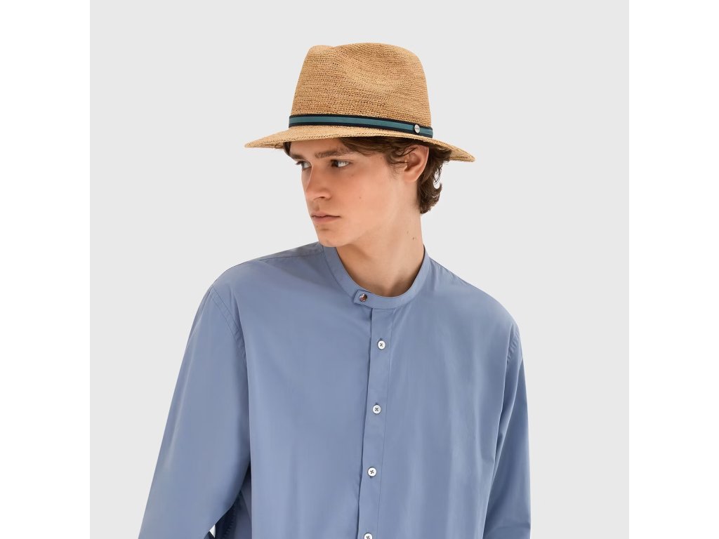 Štýlový detail v podobe 1,5 cm širokej dvojfarebnej stuhy s decentným kovovým logom Borsalino dodáva klobúku osobitý charakter. Široký krep so šírkou približne 6,5 cm poskytuje nielen ochranu pred slnkom, ale aj ležérny letný vzhľad.
