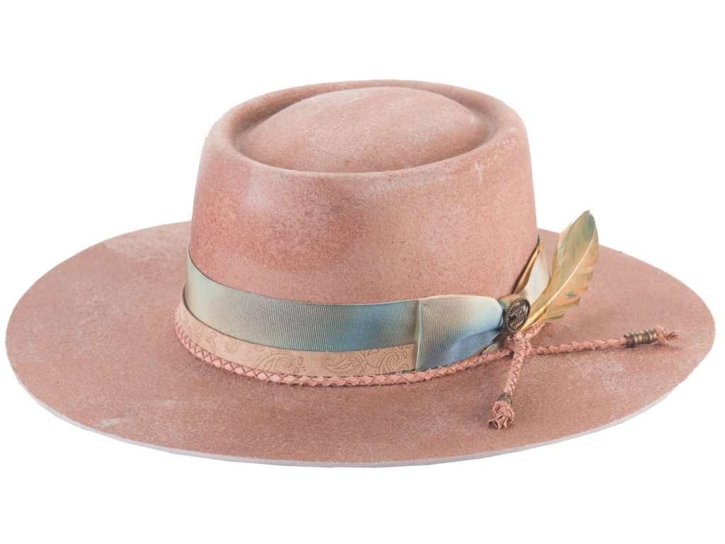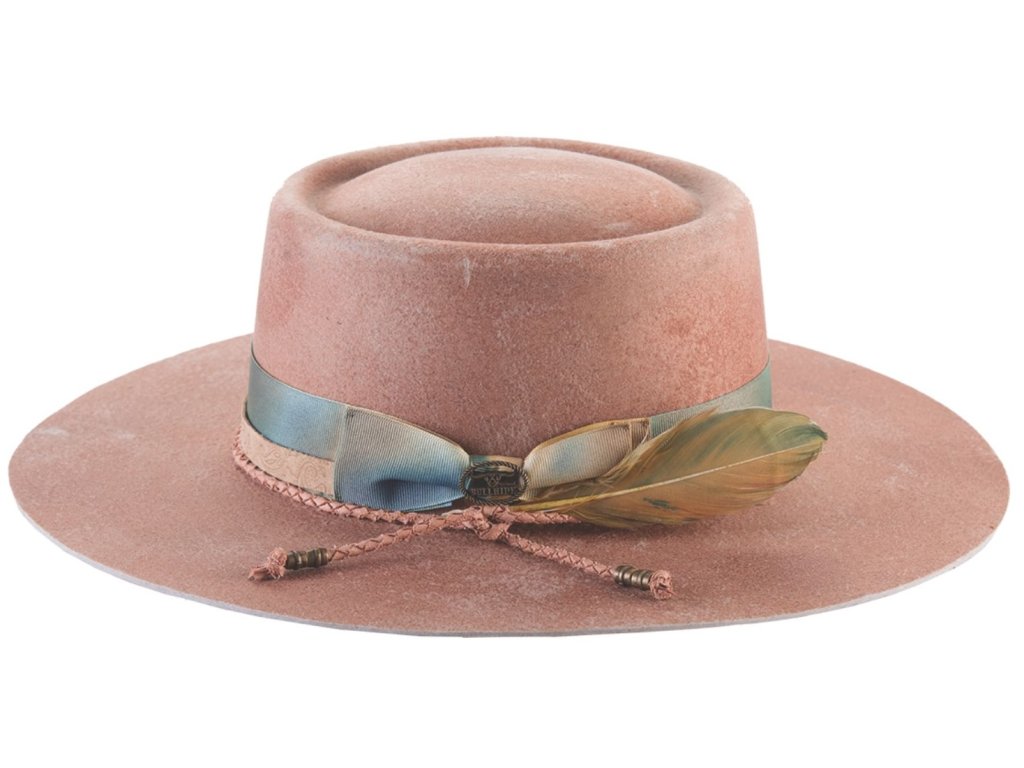 Klobúk Bullhide Morning Sky z kolekcie Western Couture prináša do sveta svieži a neopozeraný štýl. Prémiová vlna v korálovo ružovom odtieni s ľahko „opotrebovanou“ patinou pôsobí originálne a výnimočne. Široká krempa (cca 9 cm) dodáva výrazný tvar, zatiaľ čo farebne ladená stuha s paisley vzorom a saténovým prechodom pridáva elegantný kontrast.