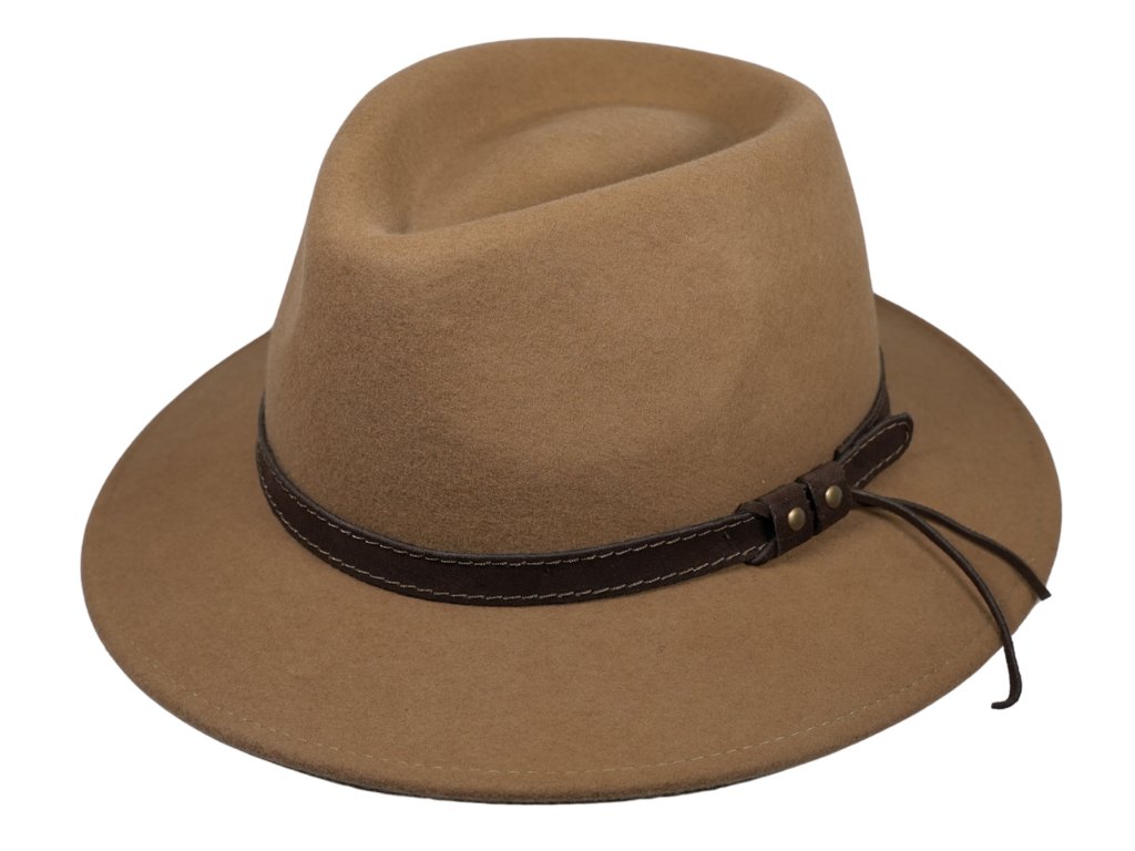 Cestovný vodeodolný klobúk vlnený od Fiebig - béžový s koženou stuhou - širák