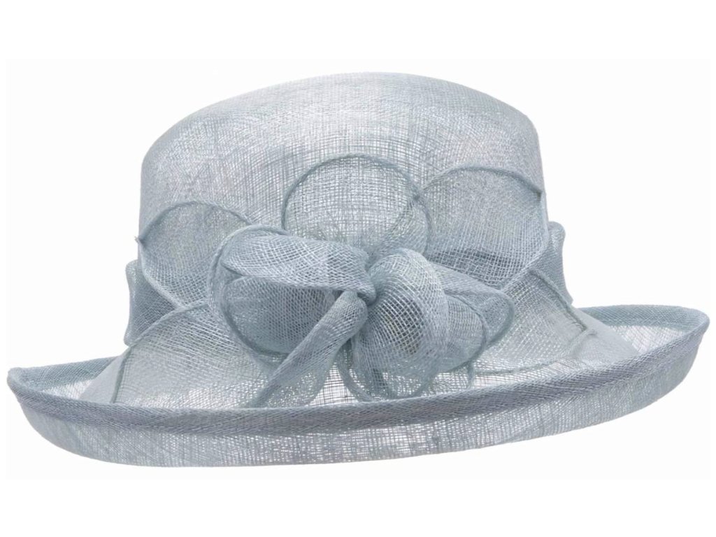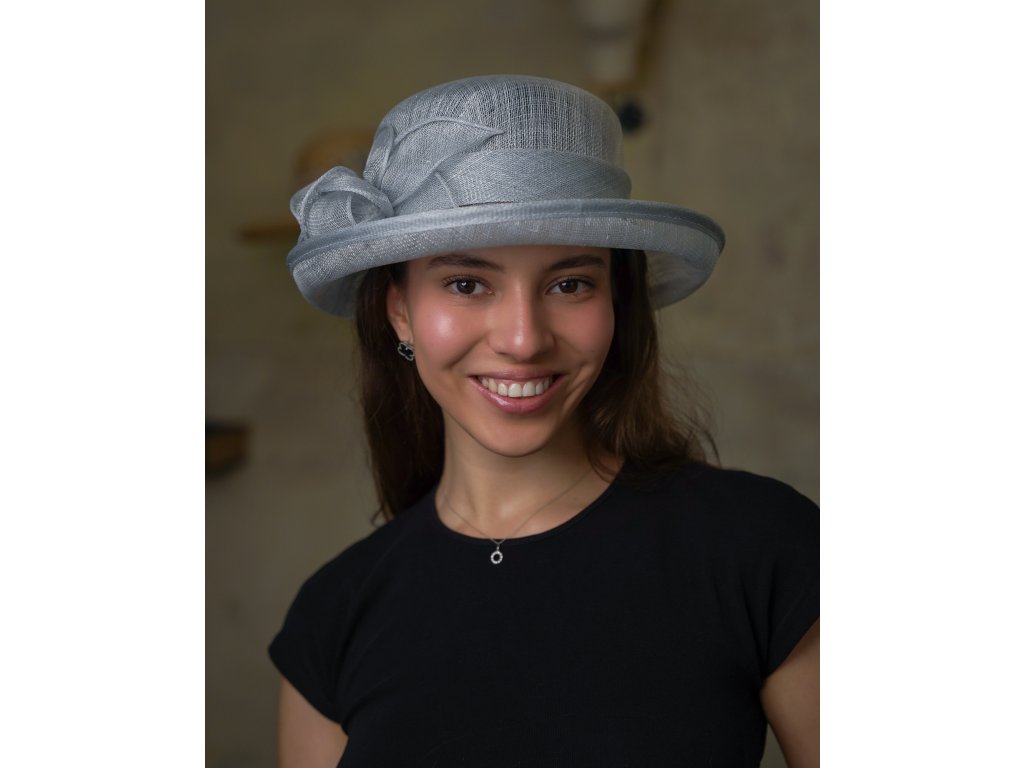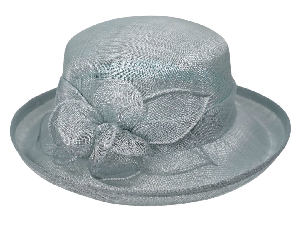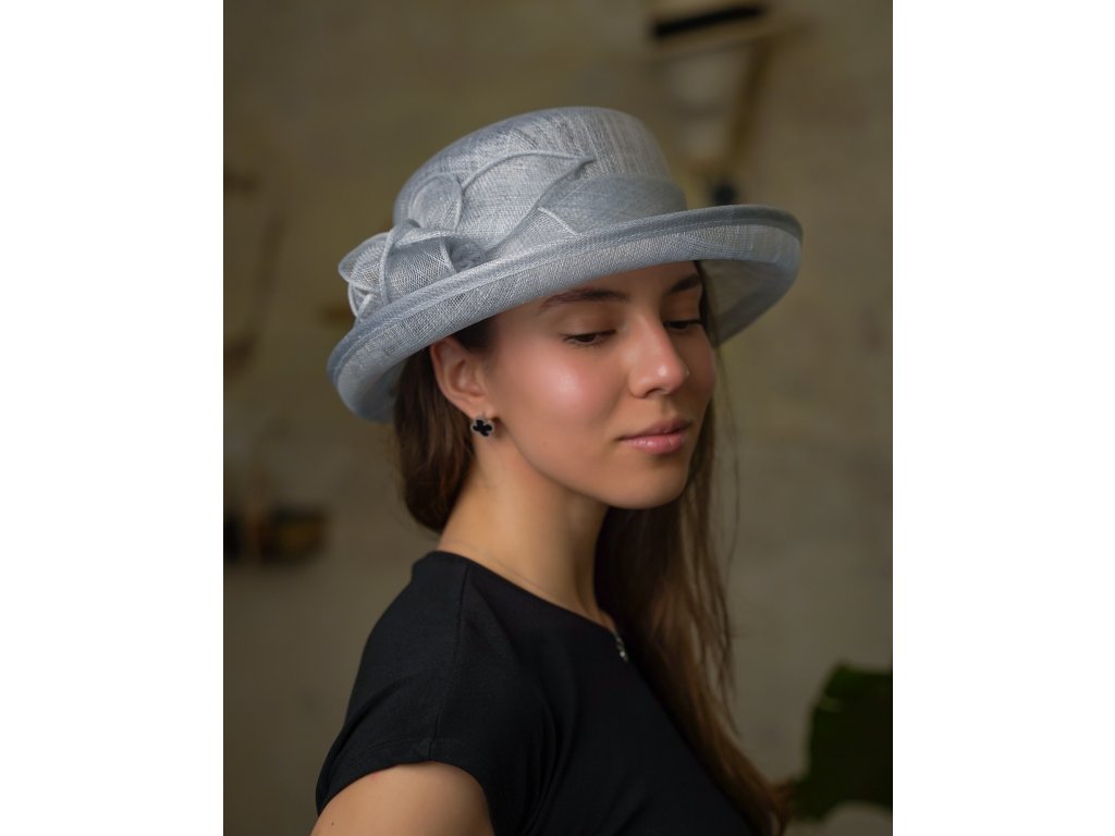 Cloche bledomodrý slávnostný klobúčik s ozdobou - zo sisalovej slamy
