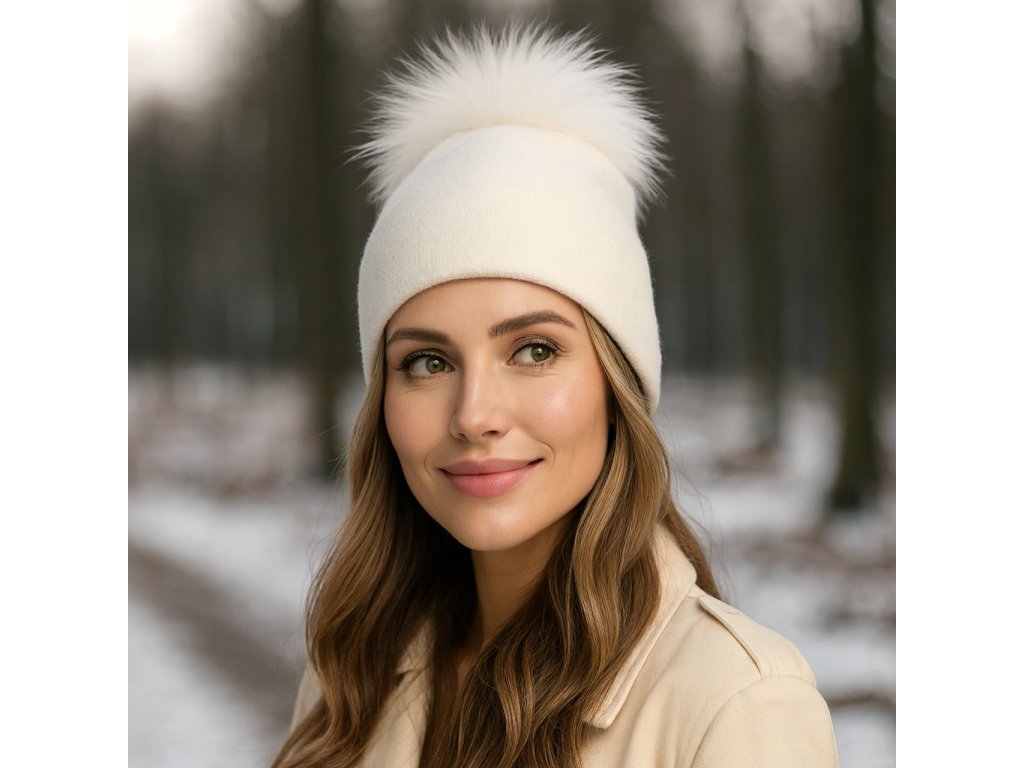Dámska biela zimná vlnená čiapka s brmbolcom