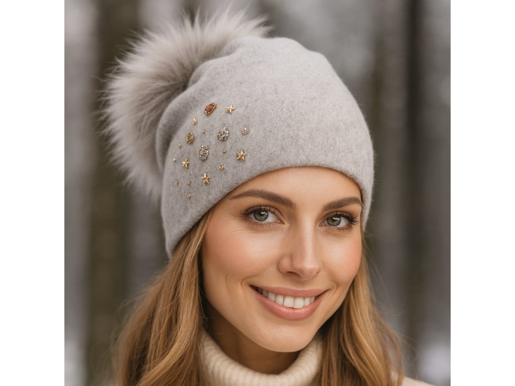 Dámska šedá zimná vlnená čiapka s prírodným brmbolcom