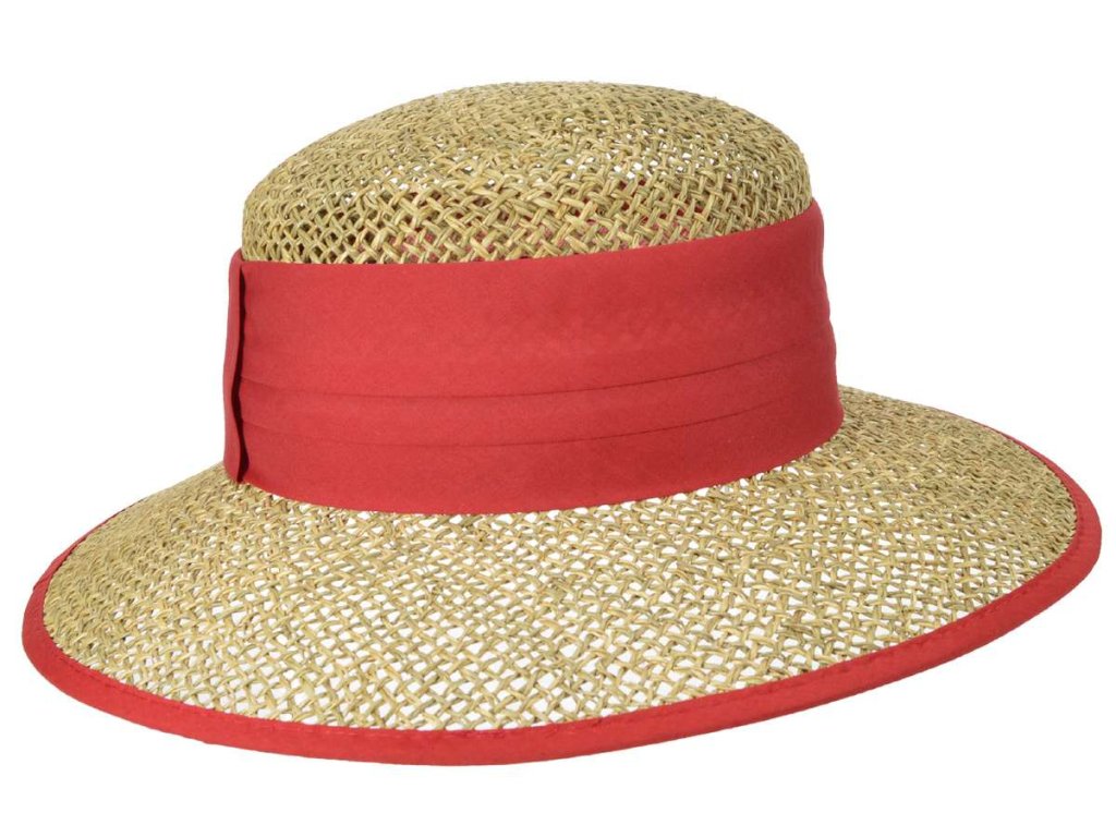 Dámský béžový letní slaměný (mořská tráva) klobouk s červenou stuhou - Seeberger since 1890