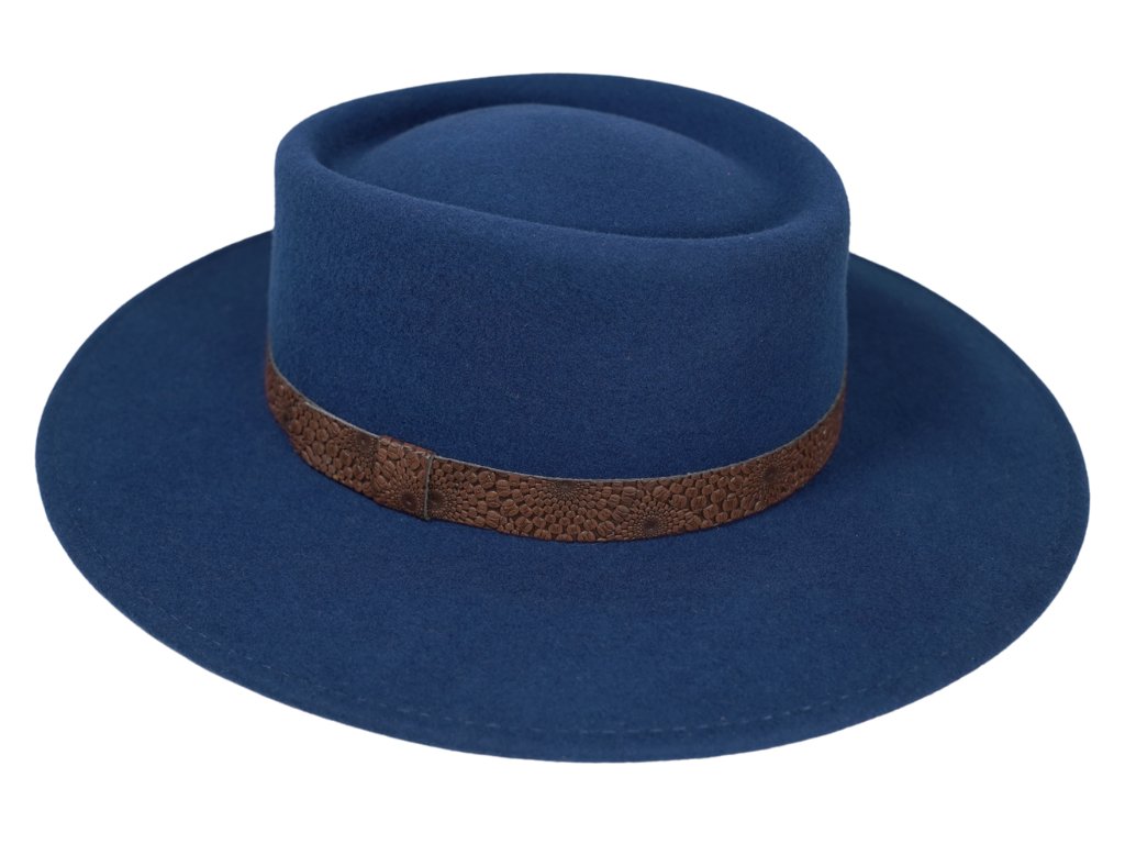 Dámsky klobúk vlnený od Fiebig s širším okrajom - modrý s hnedou koženou stuhou