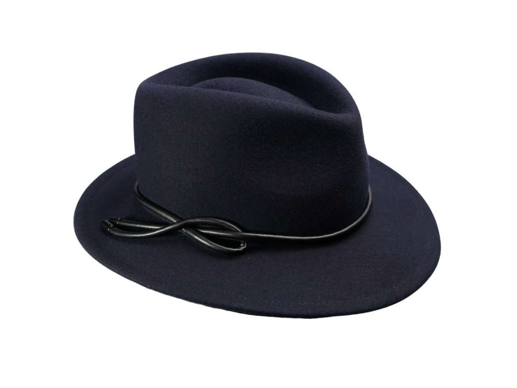 Hlboký modrý odtieň krásne vyniká v kontraste s jemnou štruktúrou zmesi vlny a kašmíru, ktorá patrí medzi najprémiovejšie materiály v klobúčnickom svete. Kašmír dodáva plsti zamatovú hebkosť, vlna zase stabilitu, pevnosť a výbornú tvarovú pamäť.