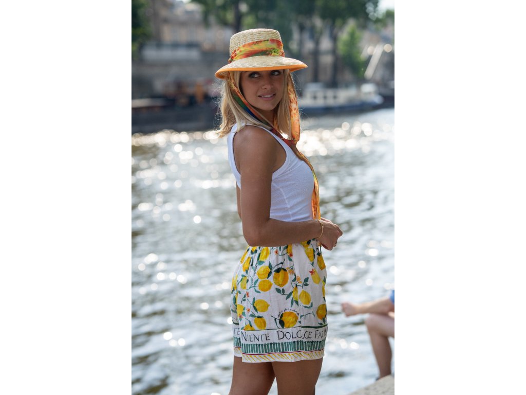 Neobyčajný letný klobúk, ktorý si môžete prispôsobiť podľa nálady aj outfitu. Tento model od francúzskej značky Fléchet je vybavený unikátnym dizajnovým zaviazaním, ktoré sa dá nosiť niekoľkými spôsobmi – voľne spustené, elegantne uviazané pod bradou, vzadu na mašli, alebo schované dovnútra klobúka, ak práve chcete čistý look.