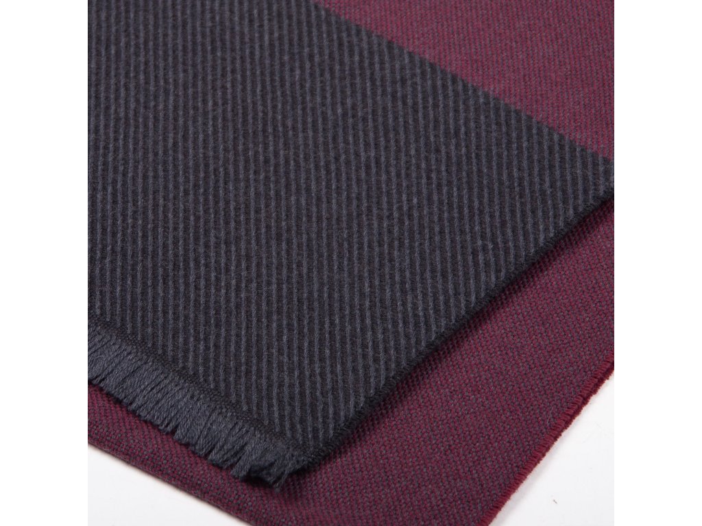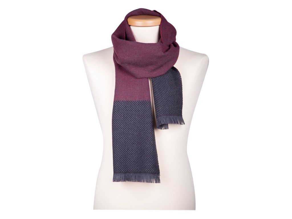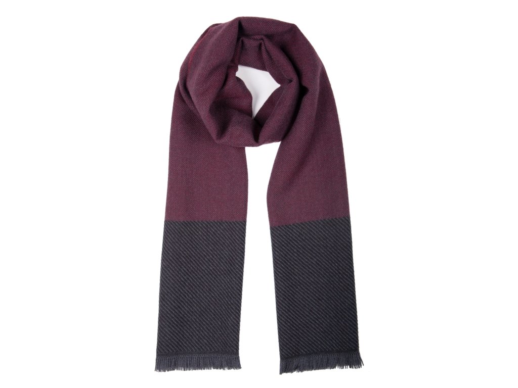Táto vlnená šatka v kombinácii vínovej a grafitovej farby je dokonalým doplnkom pre chladné mesiace – hrejivá, mäkká a vizuálne zaujímavá.