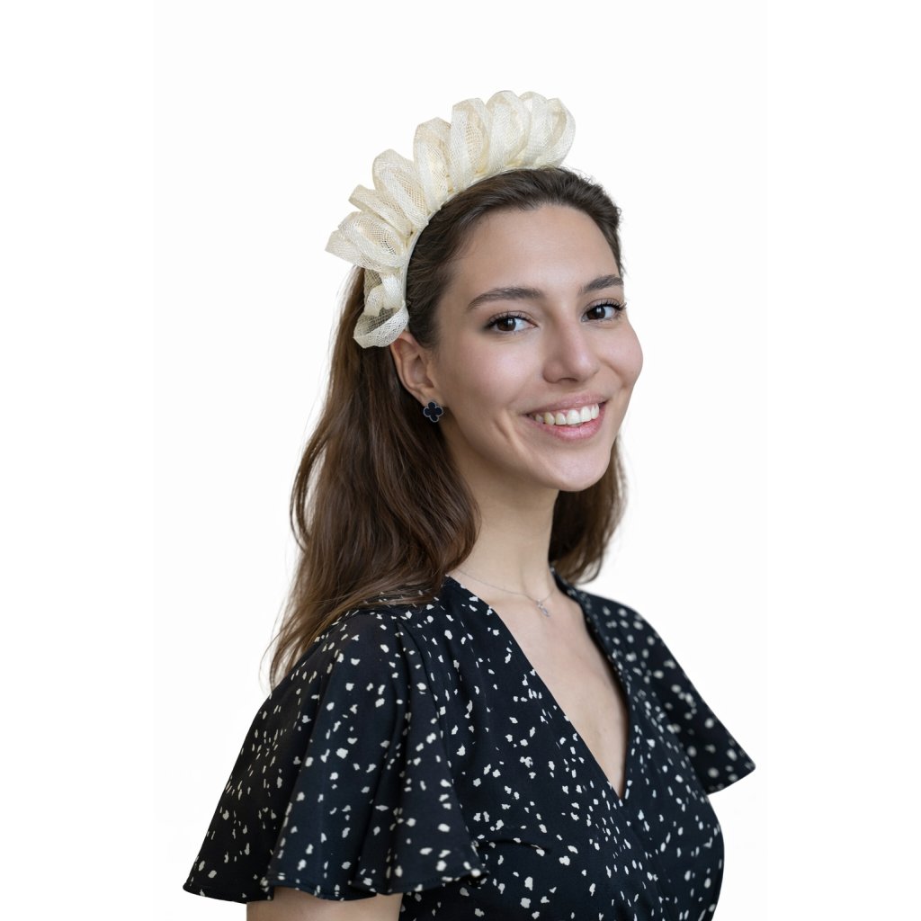 Tento béžový fascinátor je stelesnením nenápadnej elegancie a prirodzeného luxusu. Pôsobí pokojne, jemne a veľmi sofistikovane. Je to doplnok, ktorý neprekrýva outfit, ale harmonicky ho dopĺňa a dodáva mu vycibrený štýl.