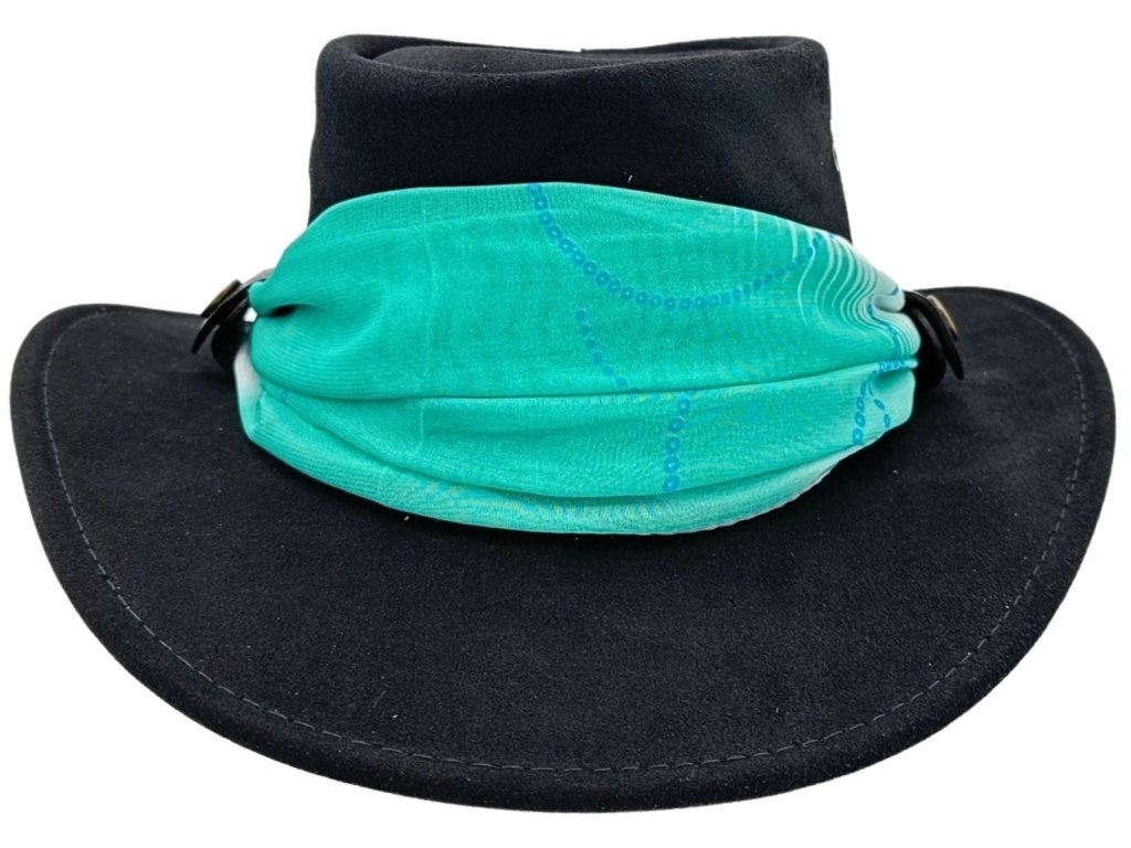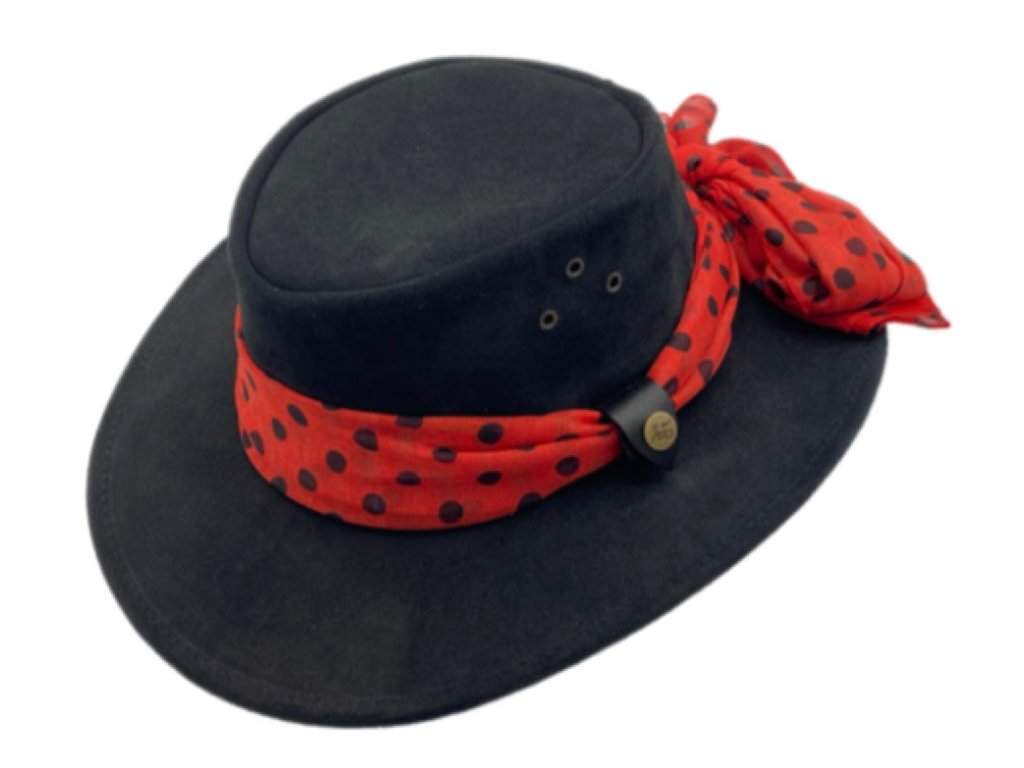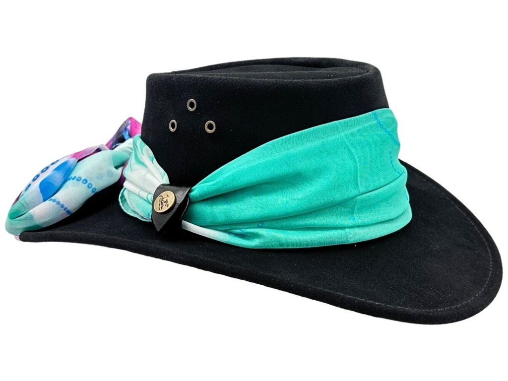 Elegantný klobúk z brúsenej kože s farebnou šatkou. Vhodný do každého počasia. Vyrobený ručne v Austrálii. Model Jillaroo.