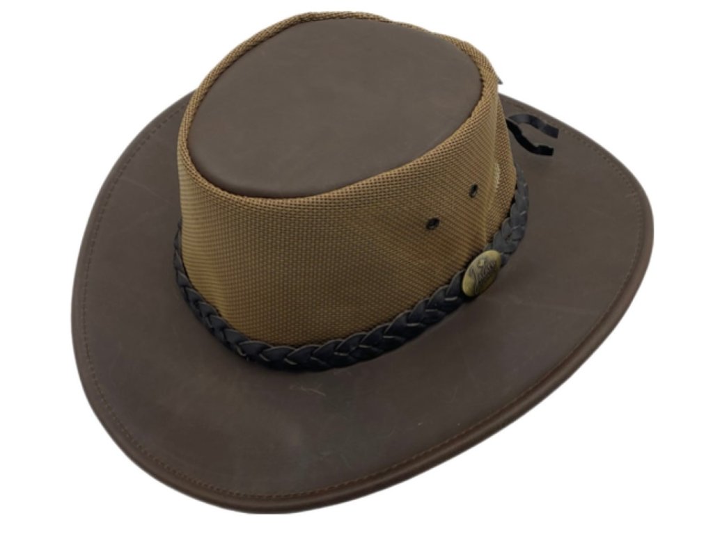 Krempa a dýnko sú vyrobené z húževnatej byvolej kože, ktorá dobre odoláva vode i času. Koruna z PVC sieťoviny zaisťuje lepšie prúdenie vzduchu, takže sa v klobúku ani v parnom dni neuvaríte. Nízka hmotnosť a pohodlný strih z neho robia ideálny letný doplnok.