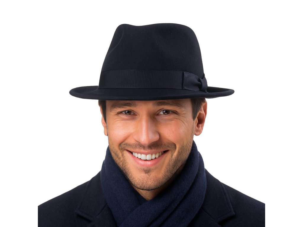 Klasický trilby klobúk vlnený so strednou krempou Bogart - modrý s modrou stuhou