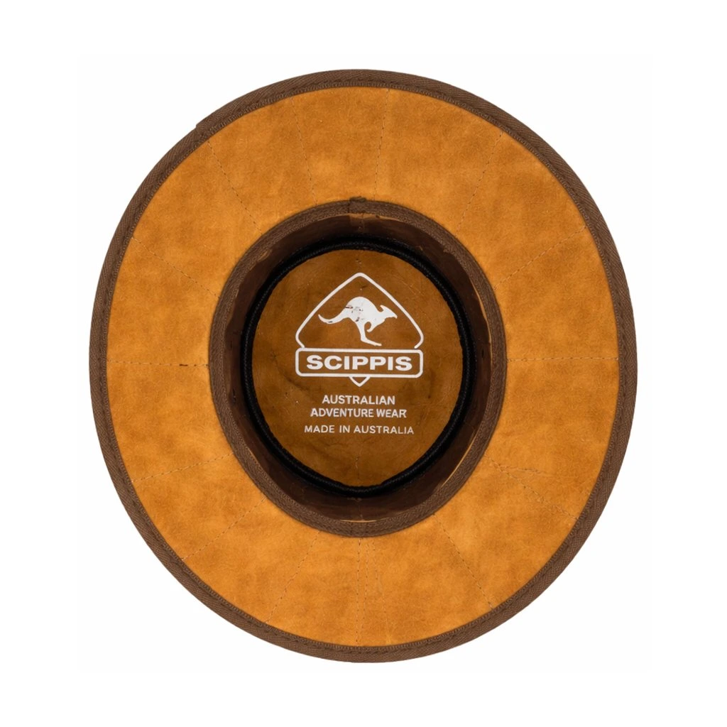 SCIPPIS Outback je originálny klobúk, ktorý odráža divoký charakter Austrálie. Je vyrobený z kože ropuchy aga (Rhinella marina), ktorá je ľahká, pevná a odolná. Pretože ropuchy sú prirodzene menšie ako hovädzia alebo klokaní koža, je tento model zložený približne z 25 jednotlivých dielov, ktoré sú precízne zošité do charakteristického patchworkového vzoru. Každý kus je tak vizuálne jedinečný.