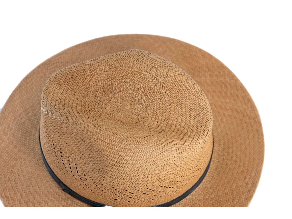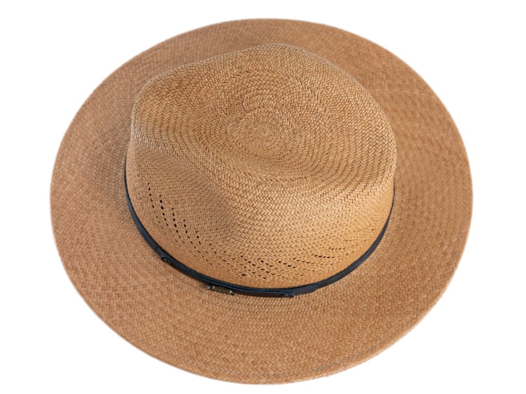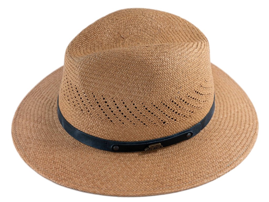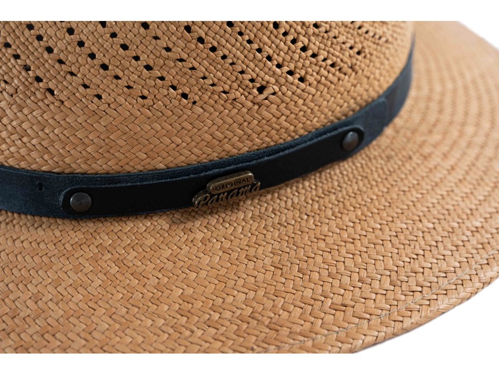Letný cognac panamský klobúk Fedora - ručne pletený - s koženou stuhou