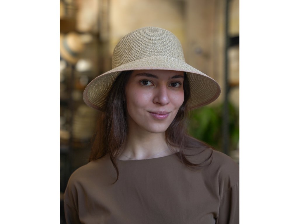 Letný dámsky nemačkavý béžový klobúk - cloche so skrátenou krempou vzadu - UV faktor 80