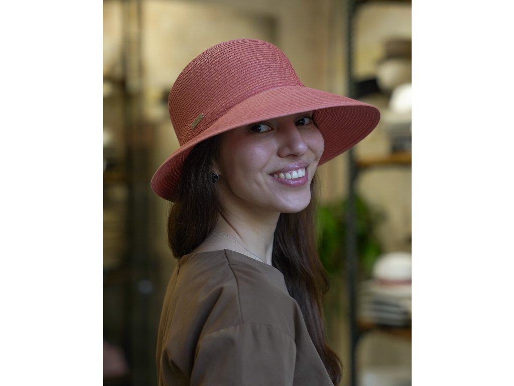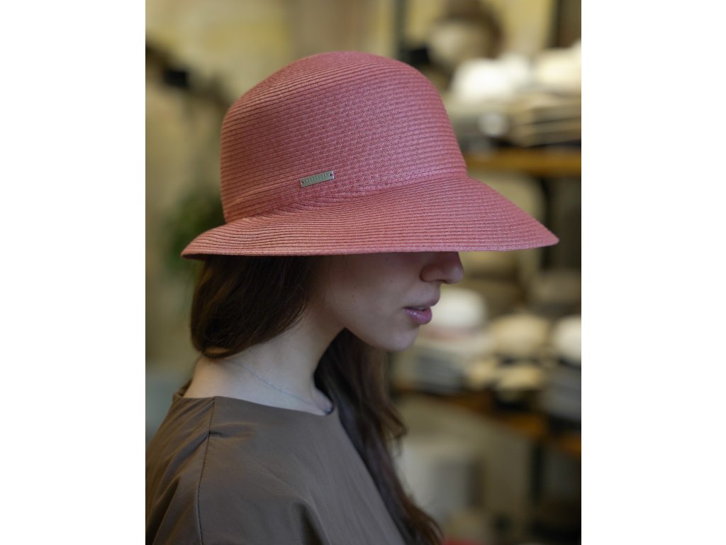 Letný dámsky nemačkavý ružový klobúk - cloche so skrátenou krempou vzadu - UV faktor 80