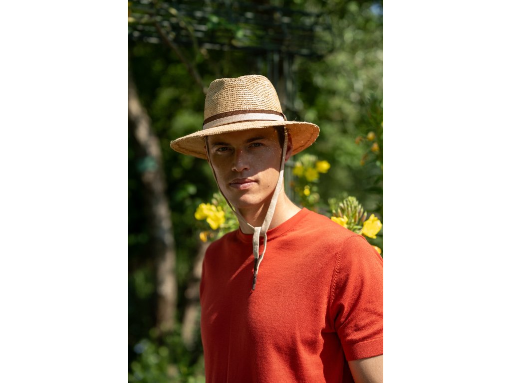 Je vyrobený zo 100% prírodnej rafie, má širokú krempu, decentnú dvojfarebnú stuhu a praktickú textilnú šnúrku pod bradu, ktorá klobúk udrží na mieste aj vo vetre. Ideálny spoločník na výlety, do záhrady aj k moru.