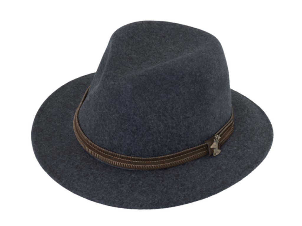 Poľovnícky klobúk z vlnenej plsti v elegantnej antracitovej farbe. Nezmačkavý, zvládne aj dážď a zdobí ho kožená stuha s kovovým odznakom jeleňa.